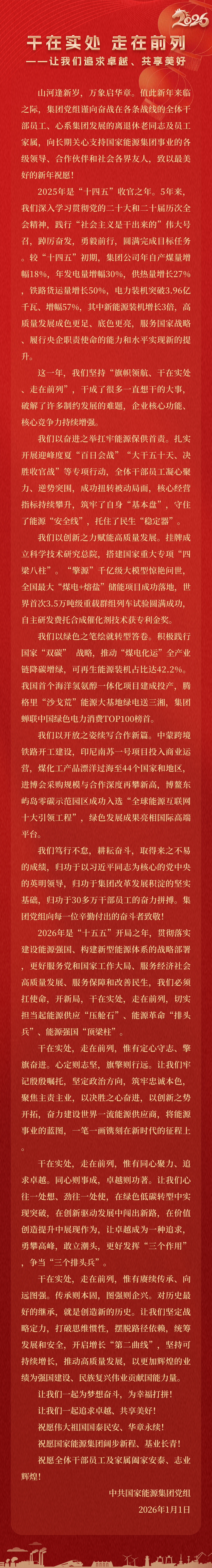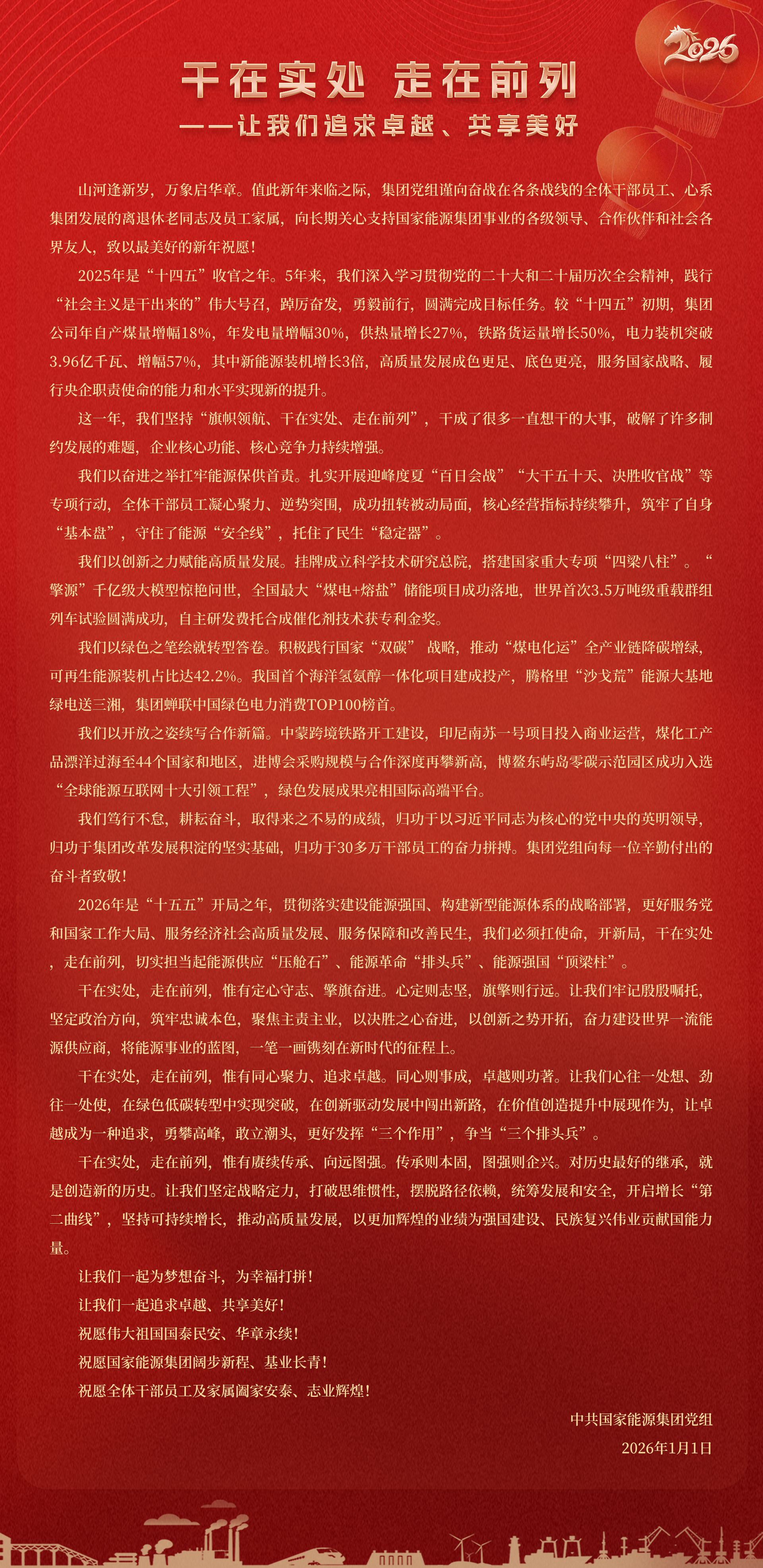 國家能源集團胸懷“國之大者”,增產(chǎn)增供、穩(wěn)價穩(wěn)市,積極服從服務(wù)國家戰(zhàn)略、保障國家能源安全、助力國民經(jīng)濟穩(wěn)增長,推動煤炭安全綠色智能、煤電清潔高效穩(wěn)定、現(xiàn)代煤化工高端多元低碳、運輸物流協(xié)同一體、新能源多元創(chuàng)新規(guī)?;l(fā)展,全力擔(dān)當(dāng)能源強國頂梁柱,能源供應(yīng)壓艙石,能源革命排頭兵。